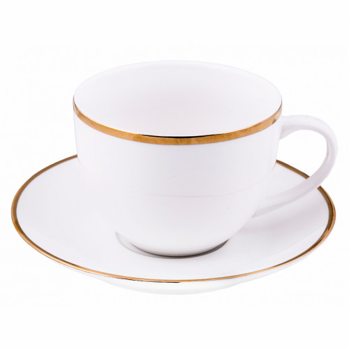 Чайна пара Gera выполнена из качественного фарфора. Блюдце диаметром 9 см и чашка белого цвета с золотой каймой. Можно использовать отдельно, а также с комплектом тарелок Gera.