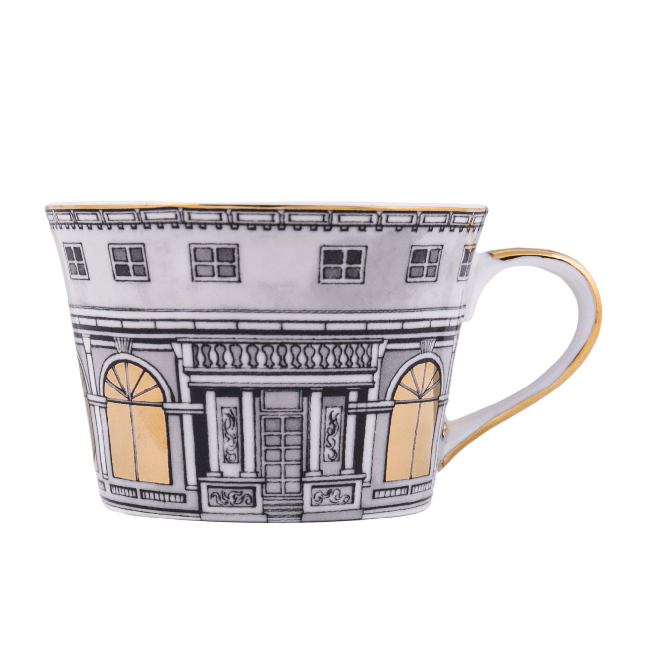 Чайна пара Killy выполнена из качественного фарфора. Блюдце диаметром 9 см и чашка белого цвета орнаментом и золотой каймой.