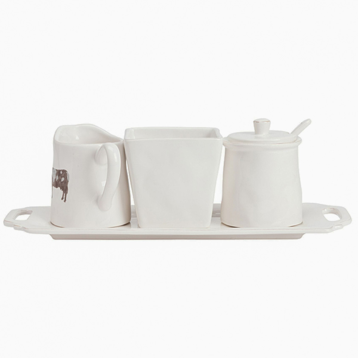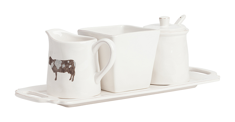 Набор для сервировки Vishille станет отличным украшением для вашего стола, все его предметы выполнены из белоснежного костяного фарфора, молочник украшены рисунком в виде коровы. Набор для сервировки Vishille станет хорошим подарком, особенно, если его приобрести в дополнение другим предметам посуды из нашего интернет-магазина. Набор состоит из 4 предметов — стакан, молочник, сахарница и поднос, на котором они размещены. Размеры: поднос - 34,5*13,5*1 см, стакан - диаметр дна 7 см, диаметр горлышка 9,5 см, высота 9 см, молочник - диаметр дна 8 см, диаметр горлышка 7 см, высота 9,5 см, сахарница - диаметр дна 8 см, диаметр горлышка 8 см, высота с крышкой 10 см, ложка - длина 12,5 см.