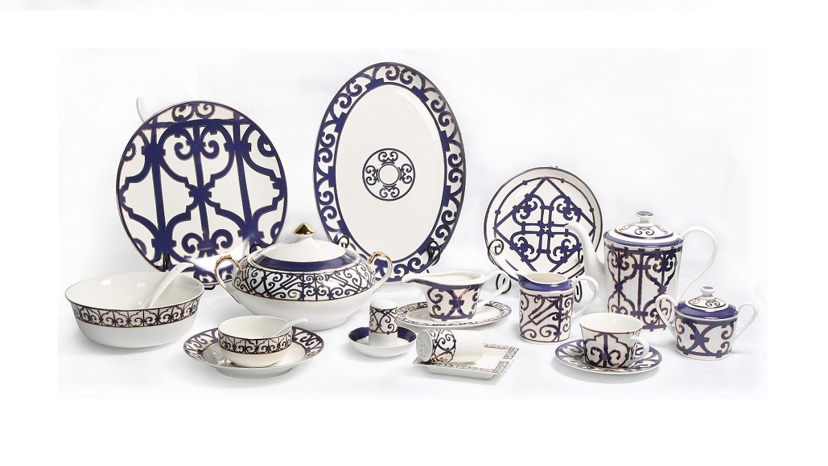 Состав: Тарелка диаметром 30,5 см - 6 шт., тарелка диаметром 25,5 см - 6 шт., тарелка диаметром 20 см - 6 шт., суповая тарелка диаметром 20 см - 6 шт., супница - 1 шт., небольшой черпак - 1 шт., салатница диаметром 20,5 см - 1 шт., салатники диаметром 11,5 см - 6 шт., овальное блюдо диаметром 35,5 см - 1 шт., овальное блюдо диаметром 30,5 см - 1 шт., чайная пара - 6 шт., чайник - 1 шт., сахарница - 1 шт., молочник - 1 шт., подставка для зубочисток - 1 шт., тарелки под пирожные диаметром 10 см - 6 шт., солонка - 1 шт., перечница - 1 шт., соусница - 1 шт., пепельница - 1 шт., маленькие ложки - 6 шт.