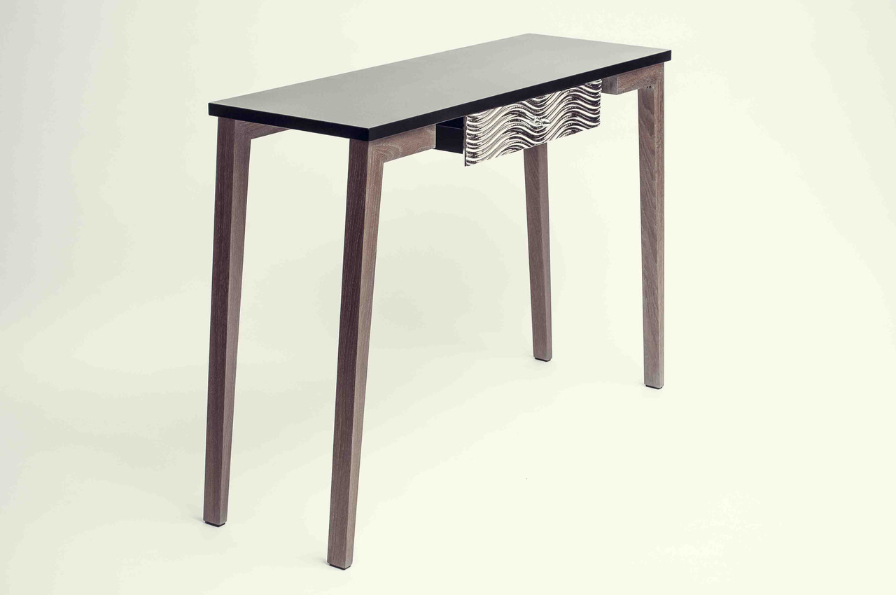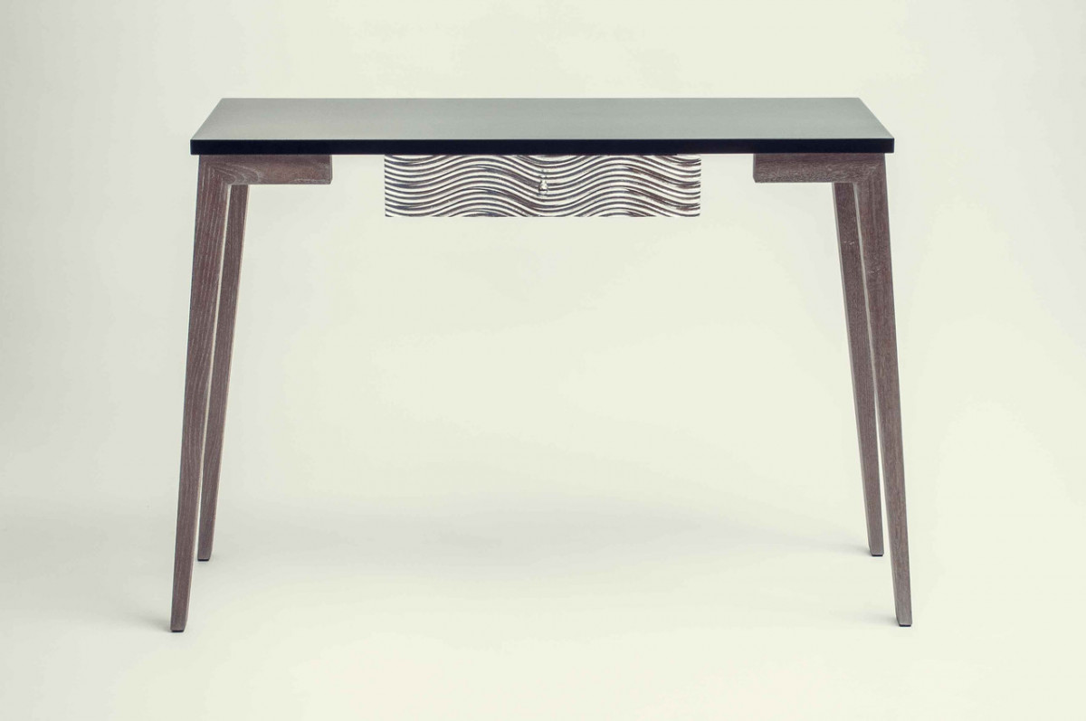 Травленый дуб благородного темного цвета, посеребрённый вручную фасад декорированный резьбой выделяют консоль Iota даже в роскошных интерьерах в стиле Ар-деко. Её можно использовать, как призеркальный или туалетный столик, интерьерный столик для цветов, картин и предметов декора. За ней можно поработать с ноутбуком или планшетом, а благодаря фасадам с обеих сторон она хорошо смотрится по центру комнаты.