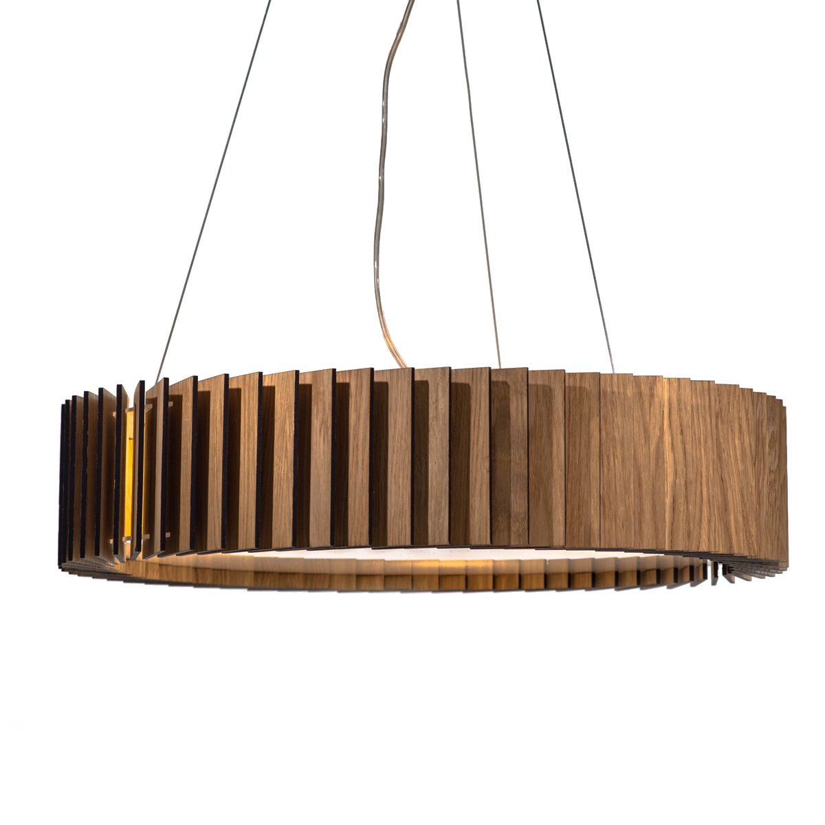 Люстра Ротор шпон дуба D55. Ротор представляют собой люстру, основание которой изготовлено из акрилового матового стекла, деревянные пластины выполнены из шпона дуба и покрыты защитными маслами и воском. Светильник оснащён 4 патронами для светодиодных лампочек, что обеспечит яркий поток света для всего помещения. Свет проходит через деревянные лопасти, направленные под углом, и рождает впечатляющие узоры на стенах. А когда светильник выключен, он становится элементом декора интерьера. Светильник Ротор заслужил бронзовую награду на международном конкурсе ADesign Award в категории Освещение.
