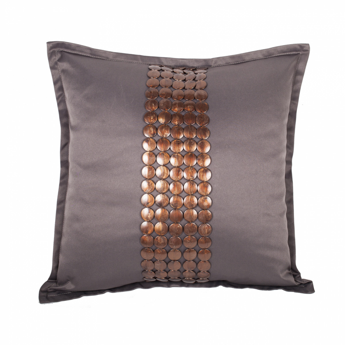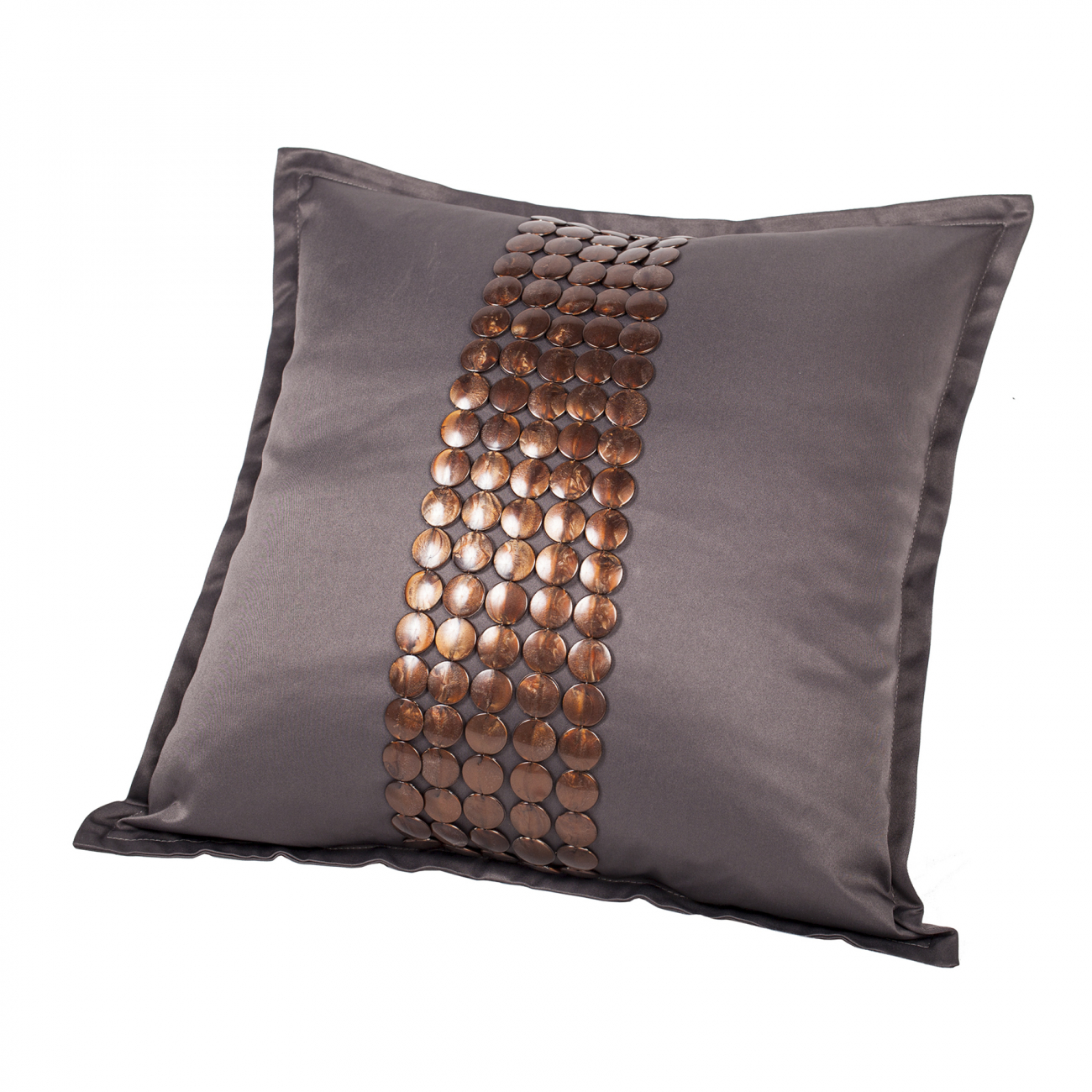 Декоративные подушки способны на все. Этот предмет сумеет дополнить любой интерьер. И наполнит уютом. Подушки могут добавить солидности помещению, или, наоборот, расположить к неформальной обстановке. Все дело в деталях. Подушка Handwork Exclusive выполнена из темно-серого сатина и декорирована вручную. Посредине располагается 5 рядов пластиковых клепок насыщенного цвета. Густой цвет ткани и переливчатость декора выглядят роскошно. Такая подушка наполнит дом сиянием и блеском.